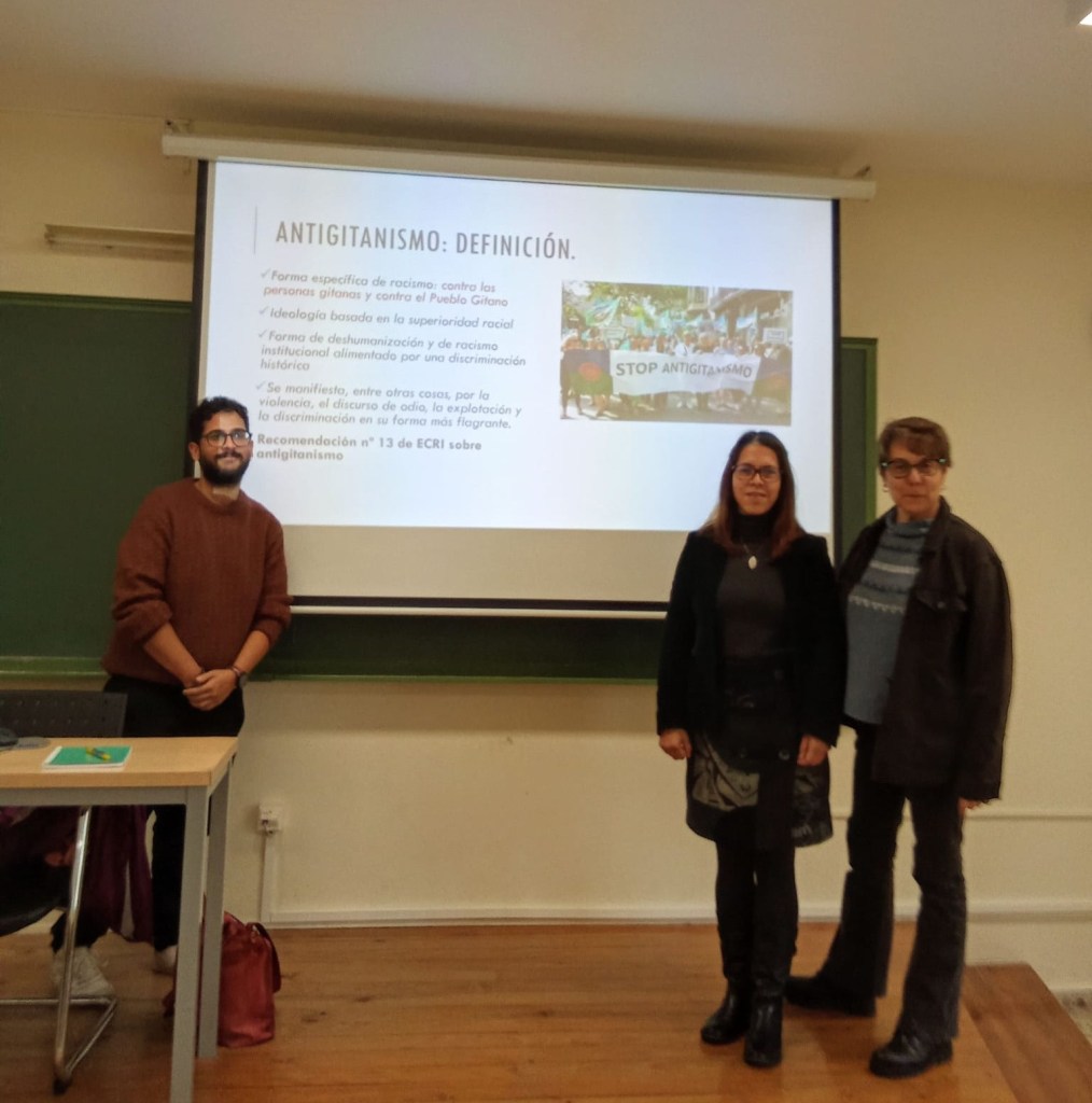 Trabajando estereotipos y prejuicios en la Facultad de Psicología, en compañía de la profesora Mónica Alzate y de Javier León, técnico de Igualdad en Fundación Secretariado Gitano.
